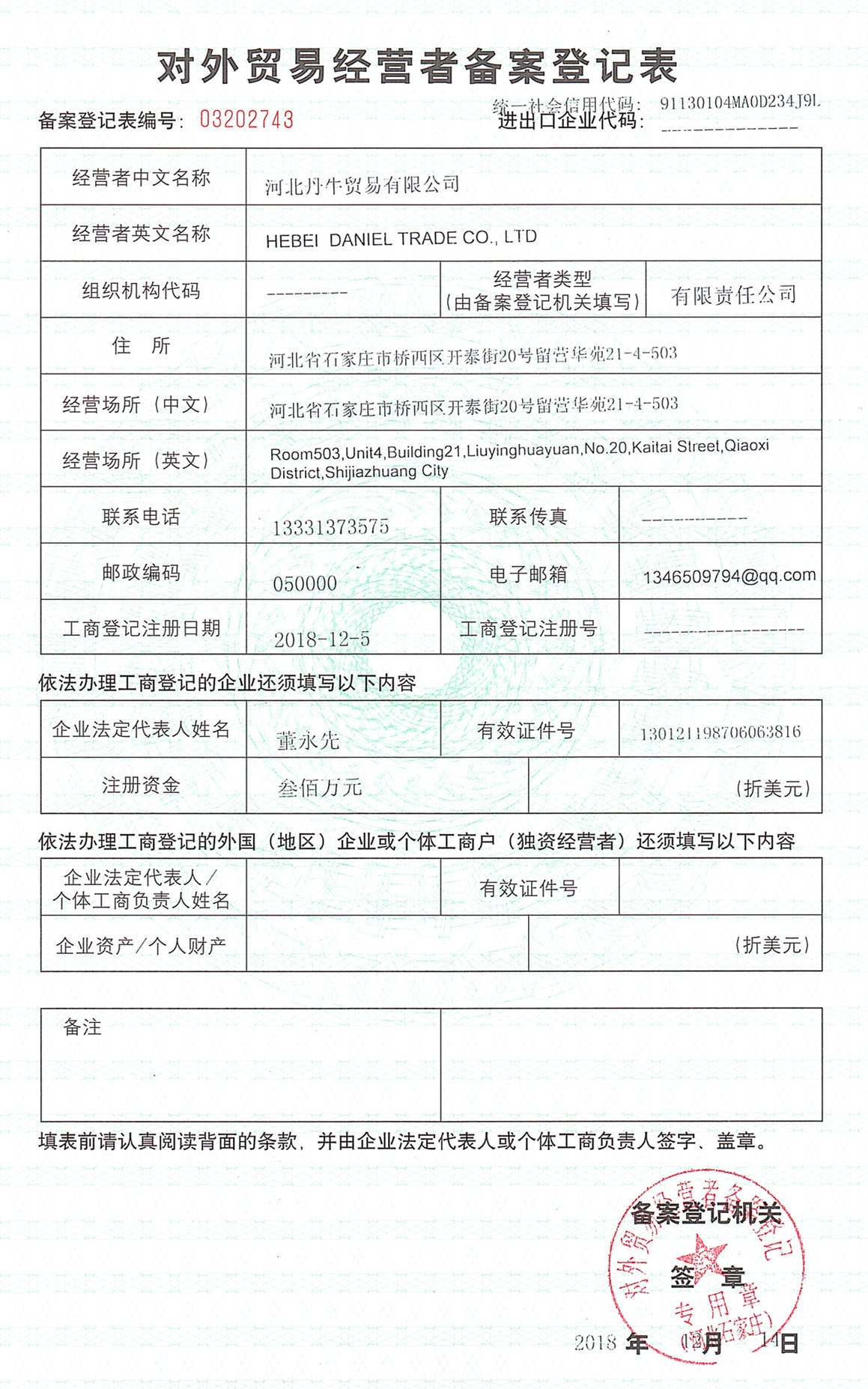 In 2018, we established the branch for Hebei Daniel Trade Co., Ltd.